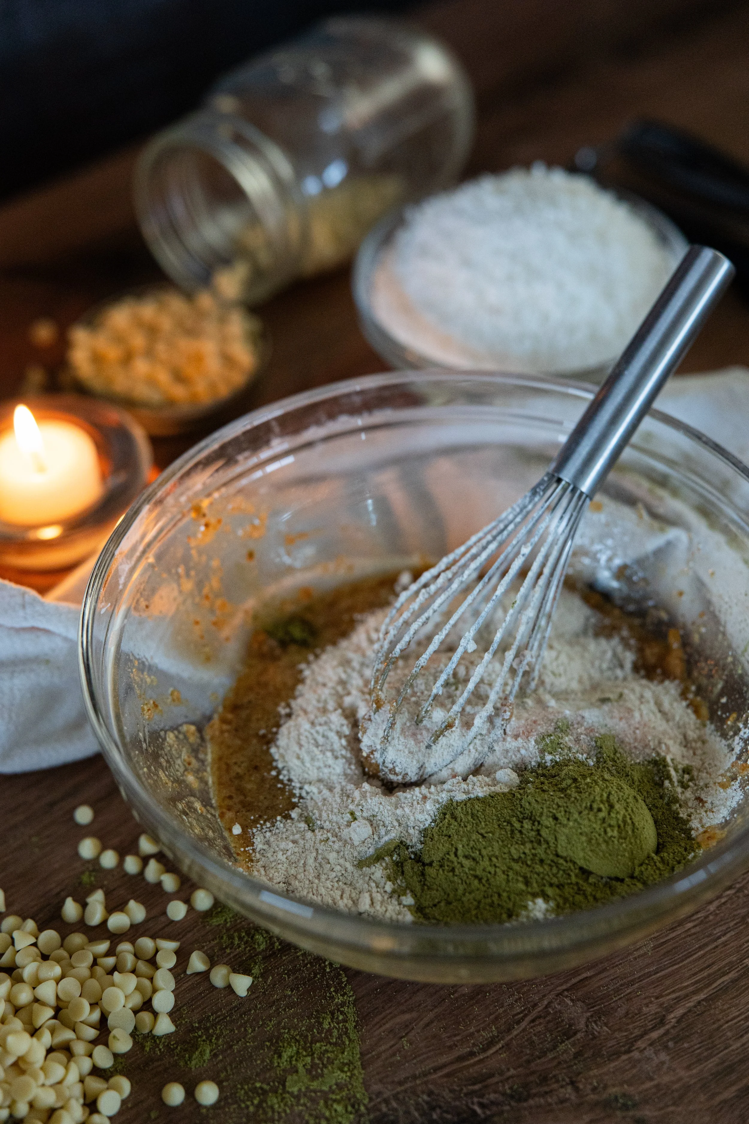 Measure out the rest of the ingredients (flour, baking soda, salt, matcha) and gently whisk together- you may want to use a spoon or fork here instead of a whisk.